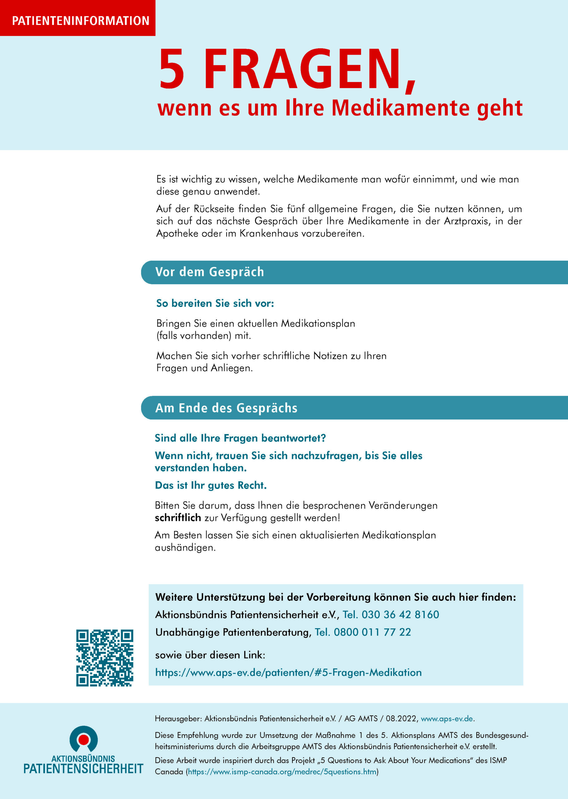 Weitere Patienteninformationen zum kostenlosen Download finden Sie auf der Website der Aktionsbündnis Patientensicherheit: